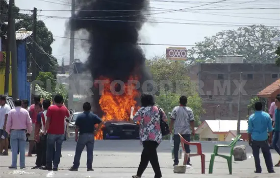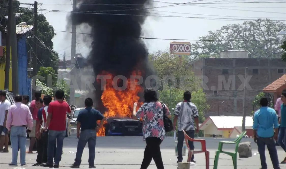 Una patrulla de la Policía Municipal fue quemada y otros vehículos fueron dañados por los profesores durante el enfrentamiento de ayer, en la zona oriente de Tuxtla Gutiérrez.