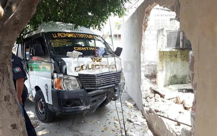 Parte de la barda de una escuela fue derribada al impactarse en ella una combi colectiva y un vehículo de una empresa tras chocar. Los reportes establecen que ninguna persona resultó lesionada.