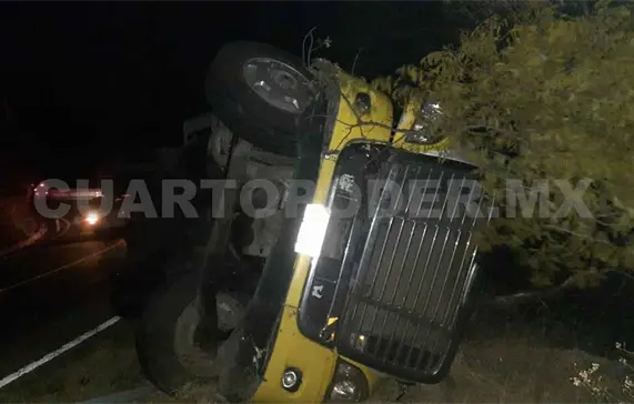 Aparentemente fue por una falla en los frenos que provocó que el chofer de un tráiler de la marca Freightliner, color amarillo, con placas 04-AN-2R, perdiera el control y volcara en una curva.