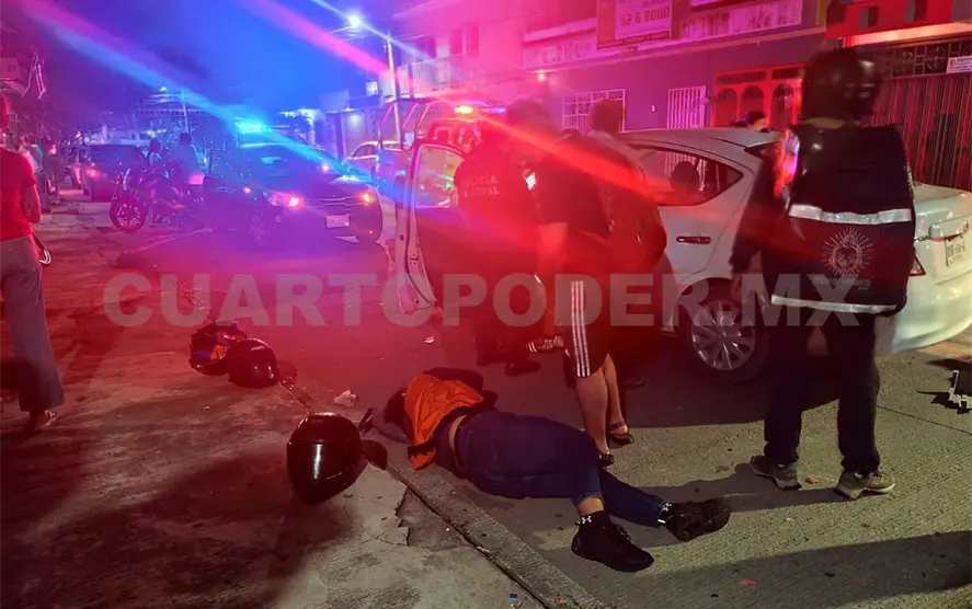 Un motociclista resultó lesionado al ser embestido por un vehículo en la esquina de la 20.ª calle Poniente y 10.ª avenida Sur en la colonia San Sebastián, localizada en la ciudad de Tapachula, lo que también dejó daños materiales por varios miles de pesos.