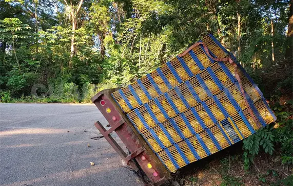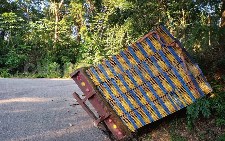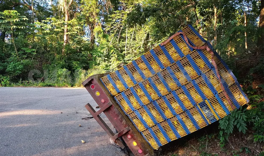 Durante la madrugada del viernes, el chofer de un camión que transportaba pollos se desplazaba con dirección a Tila, pero en las curvas el peso y el exceso de dimensión de las rejas provocaron que el vehículo perdiera el control, derrapara en la cuneta y acabara volcado.