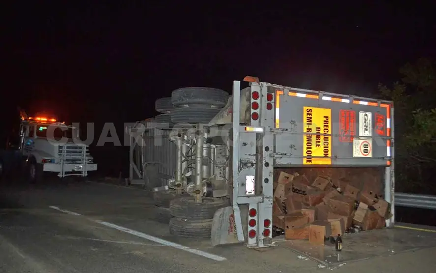 Durante la noche del domingo se registró un accidente en la carretera Costera que dejó como saldo miles de pesos en daños materiales; el remolque de un tráiler quedó volcado entre el pavimento y un barranco.