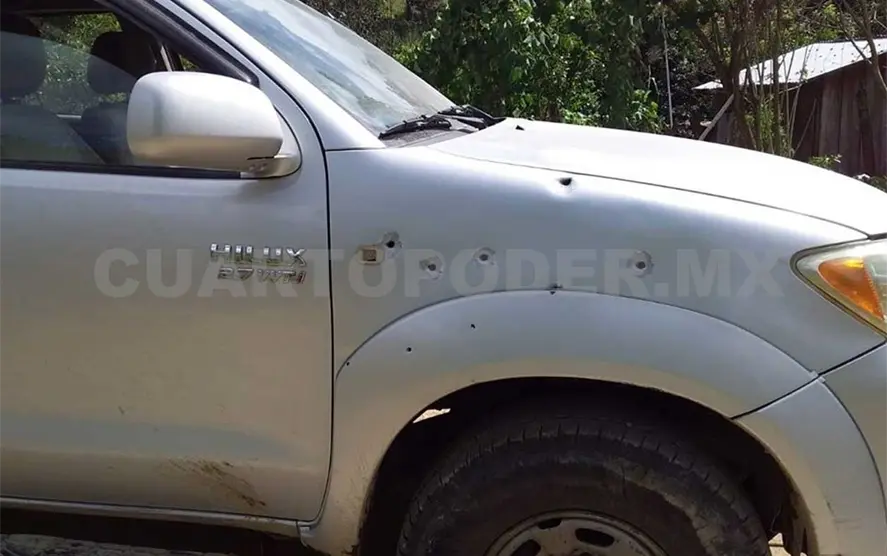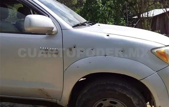En estas se puede ver una camioneta de color gris, marca Toyota tipo Hilux, con placas chiapanecas, que tenía impactos de bala en la salpicadera derecha y en los asientos traseros de la unidad, donde había a una persona acostada al parecer sin signos vitales.
