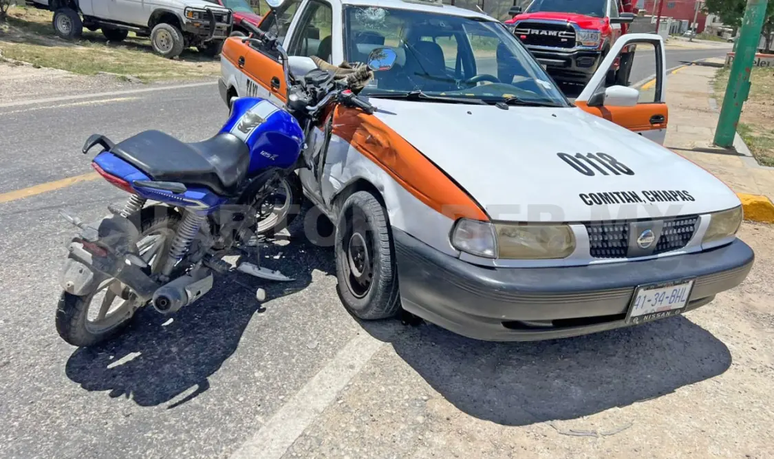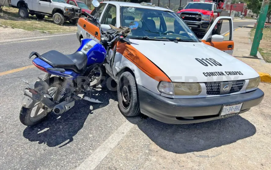 Un motociclista resultó lesionado en la tarde del sábado al colisionar contra un taxi en el municipio de Comitán, lo que movilizó a los cuerpos de emergencia para auxiliar al afectado.