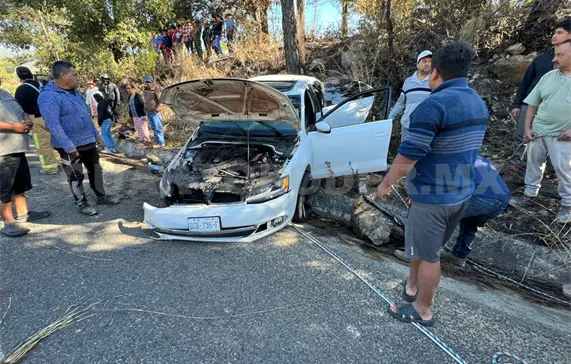 El automóvil acabó fuera del camino estampándose primero en el paredón y después en un árbol, lo cual dejó severas afectaciones en la carrocería, además de dos personas lesionadas.