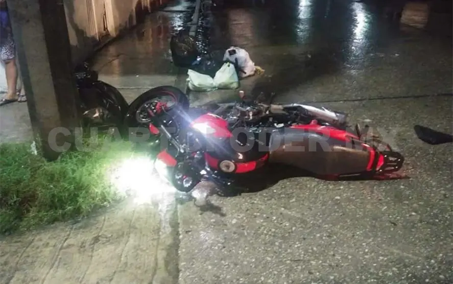Debido al potente impacto, el motociclista surcó varios metros por el aire hasta terminar tendido sobre el asfalto mojado, presentando una fractura expuesta de tibia y peroné de la pierna derecha.