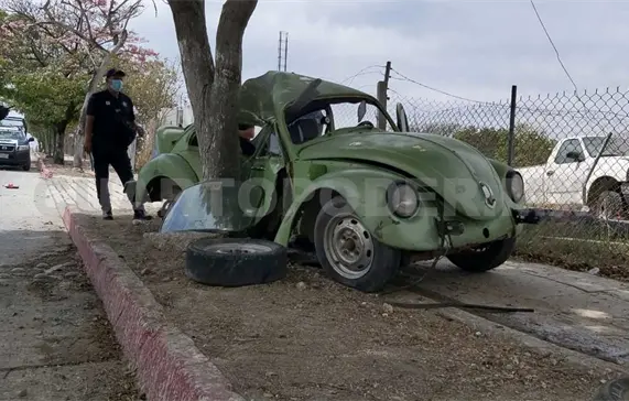 El vehículo detuvo su loca carrera tras estrellarse contra un árbol. El Vocho quedó completamente destruido.