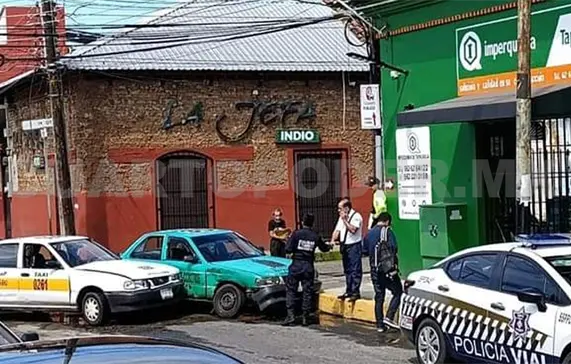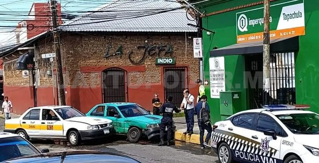Se informó que una unidad de color verde —taxi de la ruta foránea— se desplazaba de sur a norte sobre la 1ª Norte, pero al llegar a la 1ª Oriente fue impactado por un taxi blanco con franjas amarillas del servicio local.