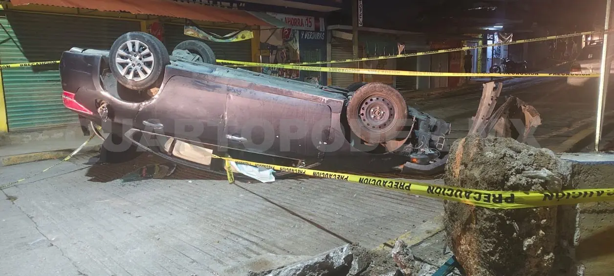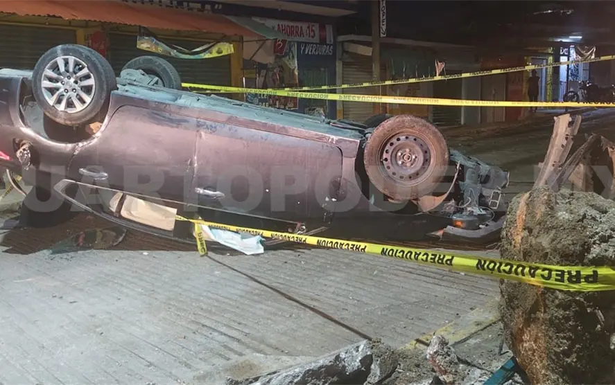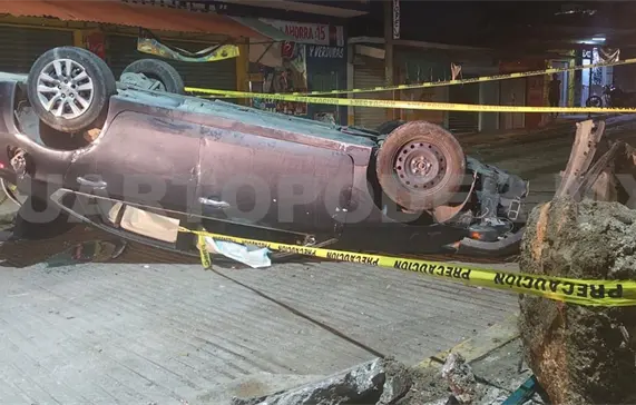 En el lugar fue localizado un automóvil sedán que estaba volcado sobre el toldo, así como tres ocupantes malheridos, por lo que se solicitó de inmediato la intervención de paramédicos.