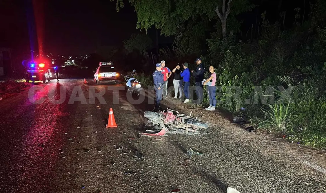 Supuestamente el automóvil circulaba con dirección al municipio de Cintalapa cuando el motorista lo impactó de frente, dejando esta parte destrozada; a su vez, el motociclista finalizó su trayecto tirado sobre la vía al salir proyectado y a unos pasos su unidad, la cual quedó como pérdida total.