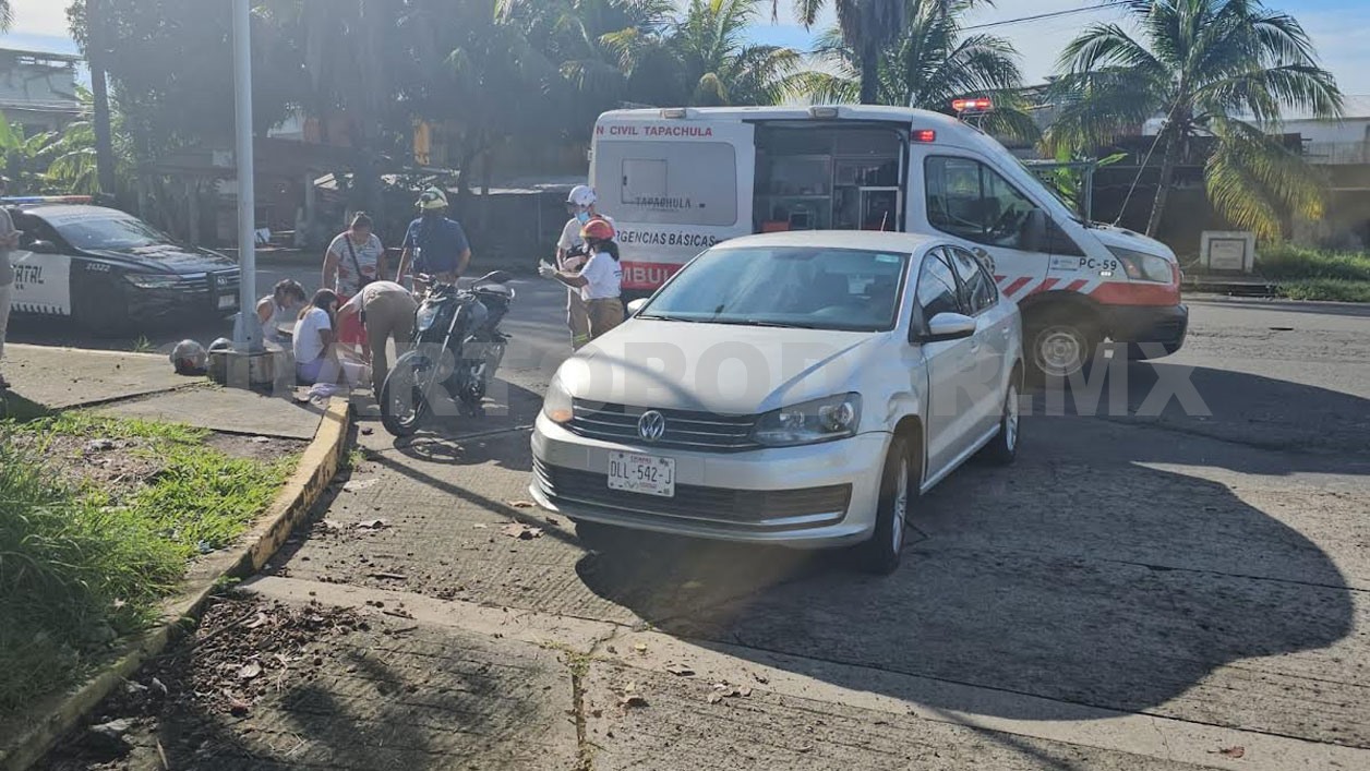 La pareja iba en una motocicleta Vento, color gris, circulaban de poniente a oriente y al pretender rebasar por el lado izquierdo, se impactaron contra un vehículo gris, cayendo al pavimento.