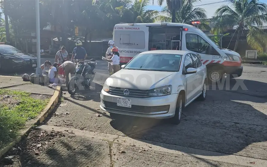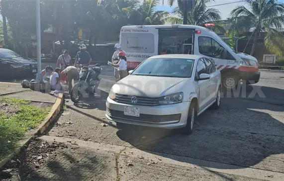 Una pareja que se desplazaba en una motocicleta resultó lesionada al rebasar por la izquierda, de forma posterior se impactó contra un vehículo.