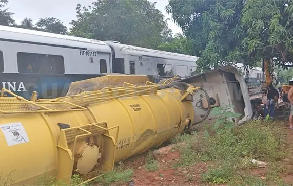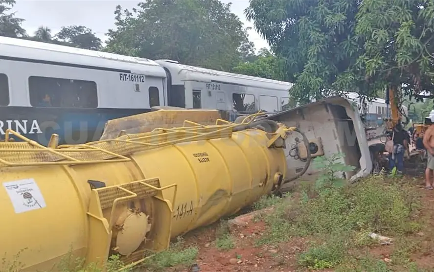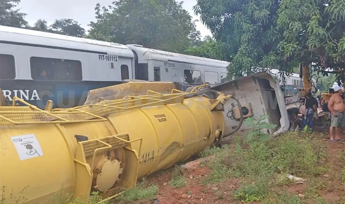 La locomotora, que realizaba su recorrido de Palenque a Juárez, no logró frenar a tiempo y acabó impactando la pipa, provocándole severos daños.