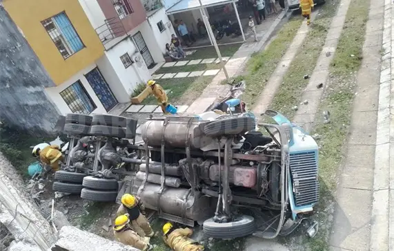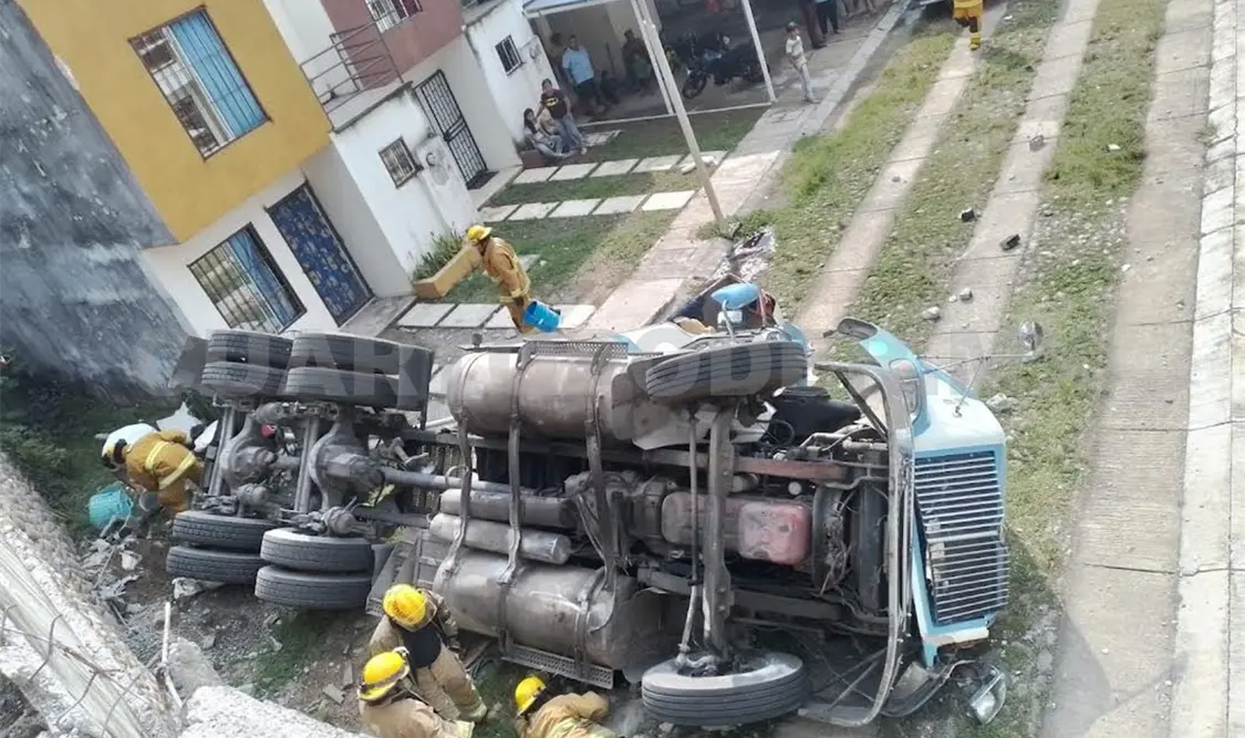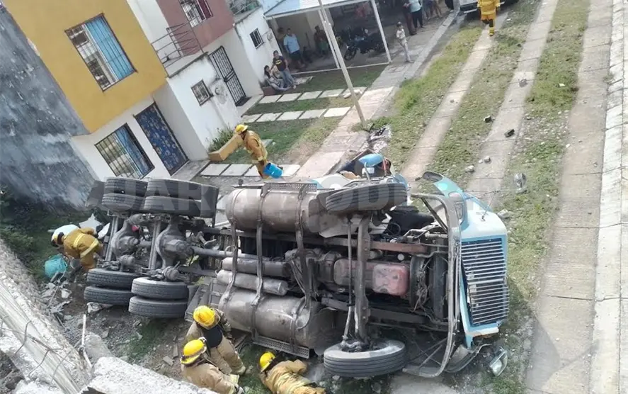 Se dijo que el tráiler Internacional salía del fraccionamiento hacia la carretera Nueva Alemania-Tapachula, cuando presentó fallas en los frenos, yéndose para atrás y volcando en forma estrepitosa.