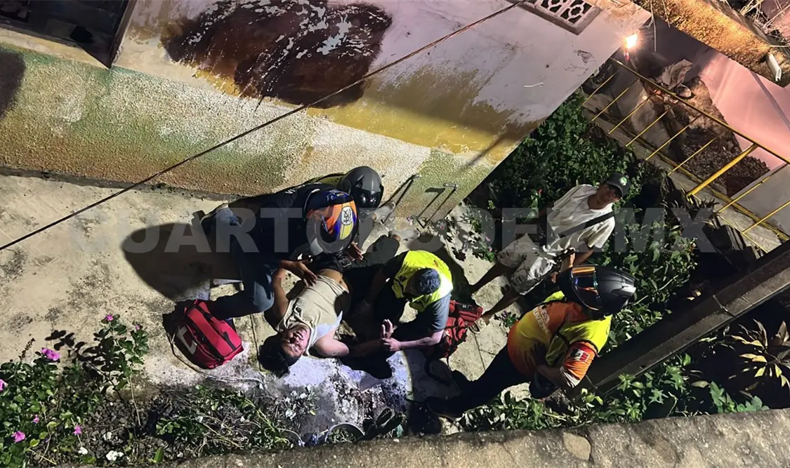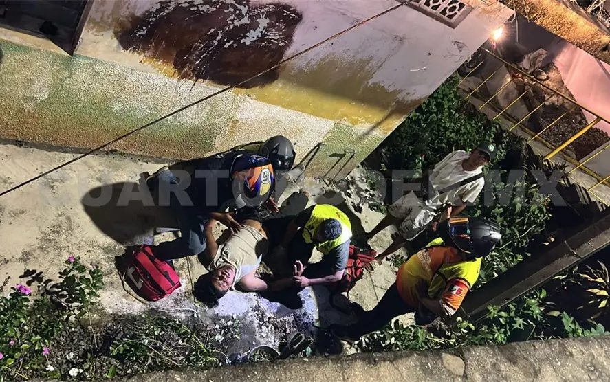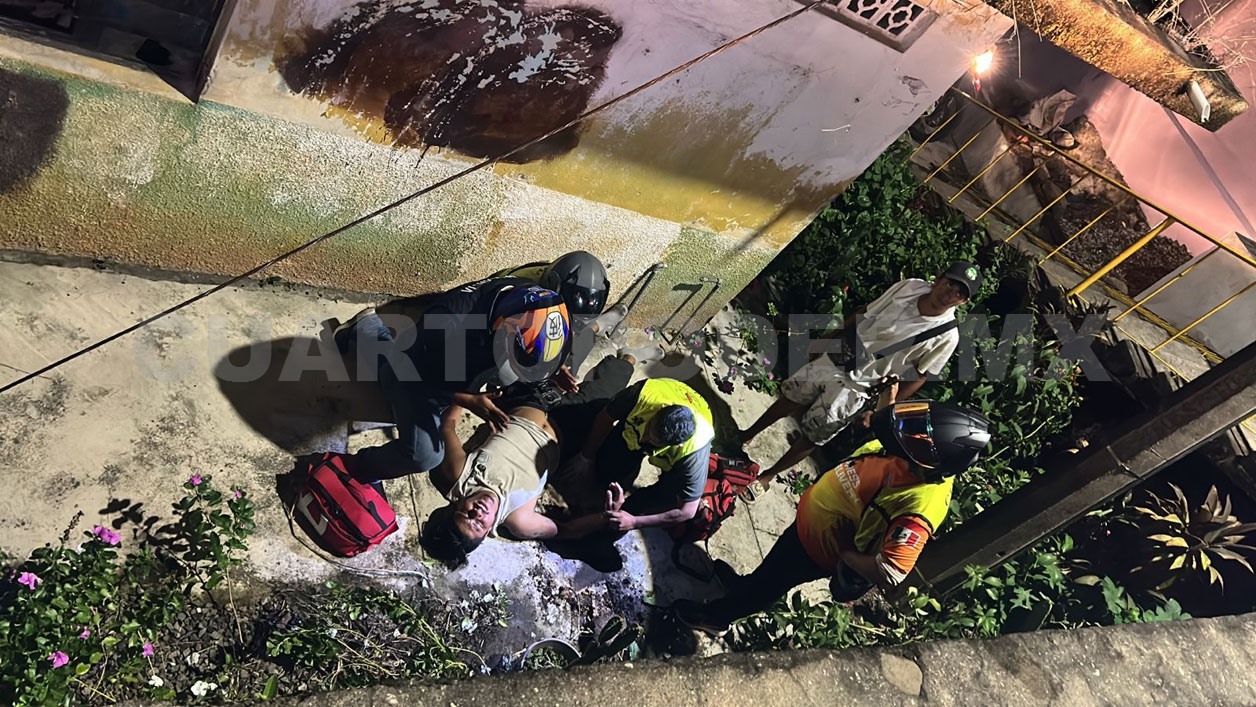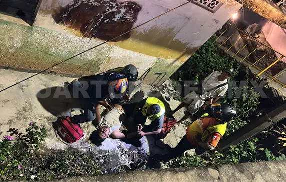 Con múltiples lesiones resultó un motociclista al salirse de la cinta asfáltica y precipitarse desde una altura de aproximadamente tres metros, en la colonia Monroy, ubicada al nororiente de la ciudad de Tapachula.