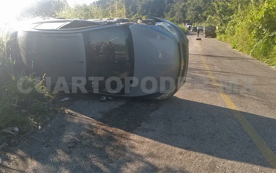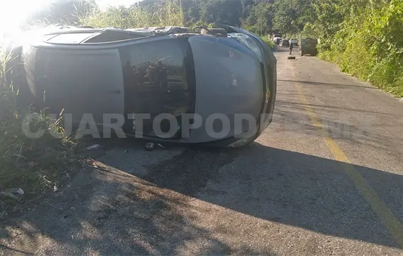 Derivado del impacto, el Aveo acabó en una aparatosa volcadura y quedó con severos daños.