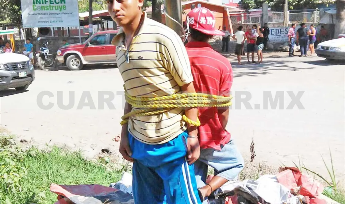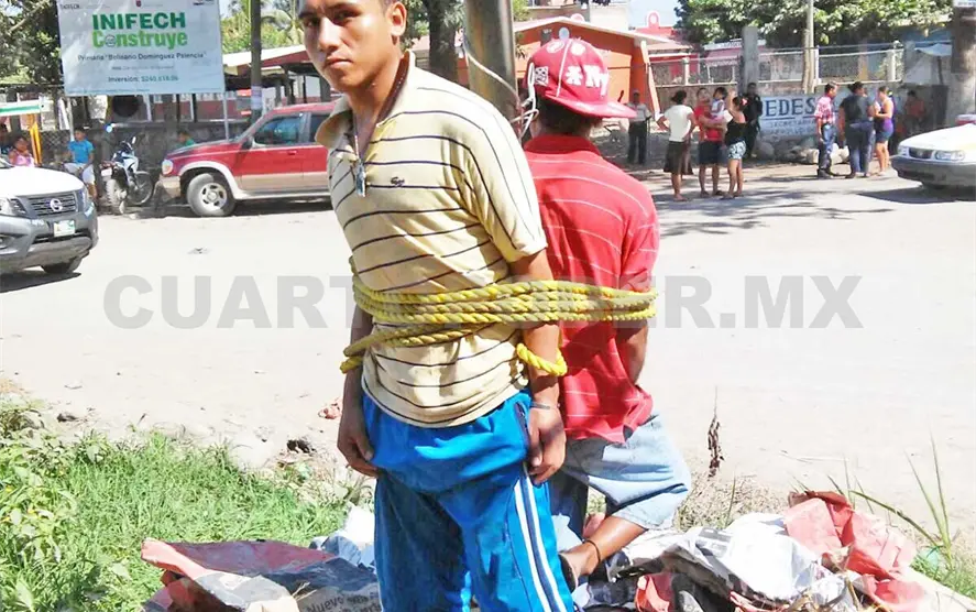 Dos presuntos delincuentes fueron detenidos por habitantes de la colonia Rivera Maya, al oriente de Tapachula, que amenazaban con lincharlos, amarrándolos a un poste y ya les habían rociado gasolina.