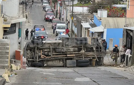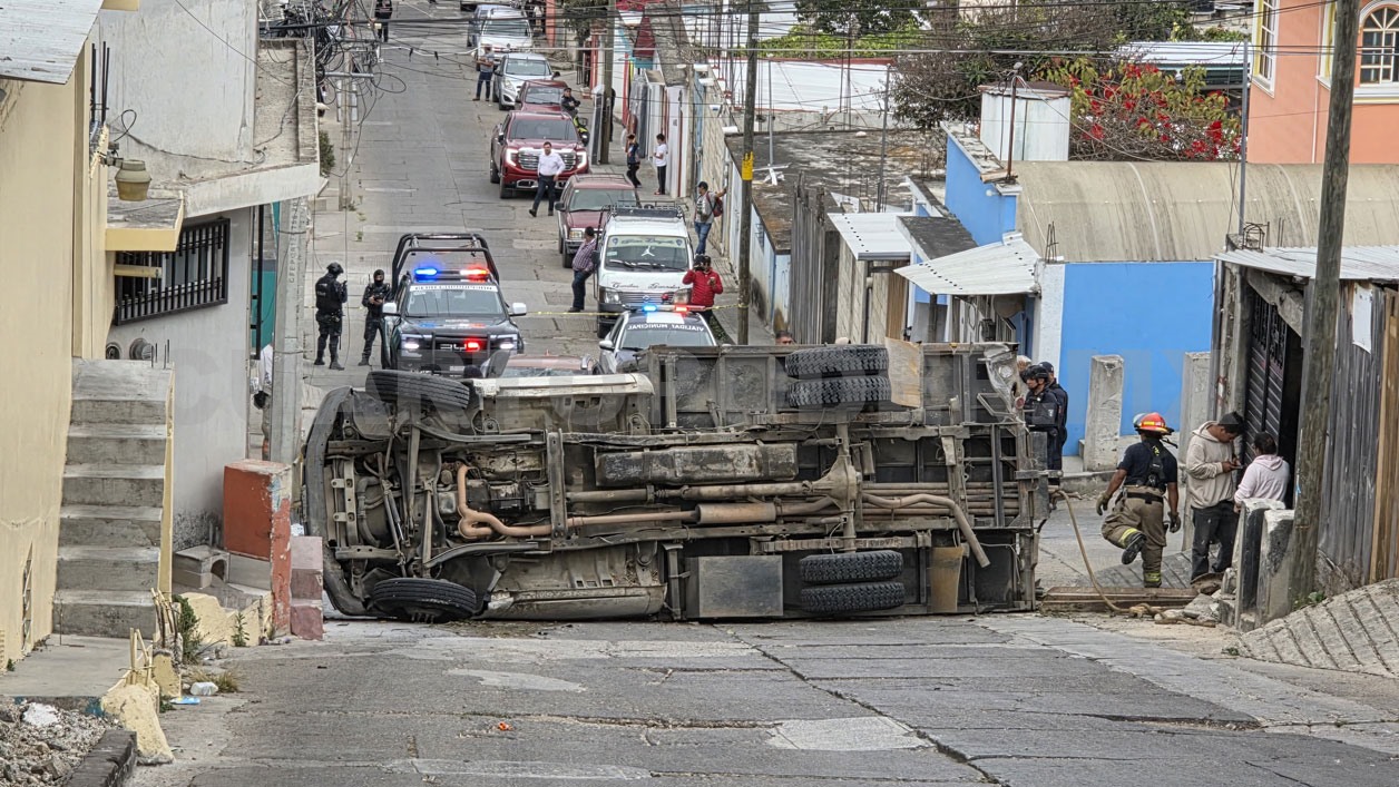 Daños materiales y un lesionado fueron el saldo de la volcadura de un camión durante la tarde del martes en el municipio de Comitán de Domínguez, esto al no lograr ascender una calle con prolongada pendiente, lo que hizo que se fuera de reversa sin control.