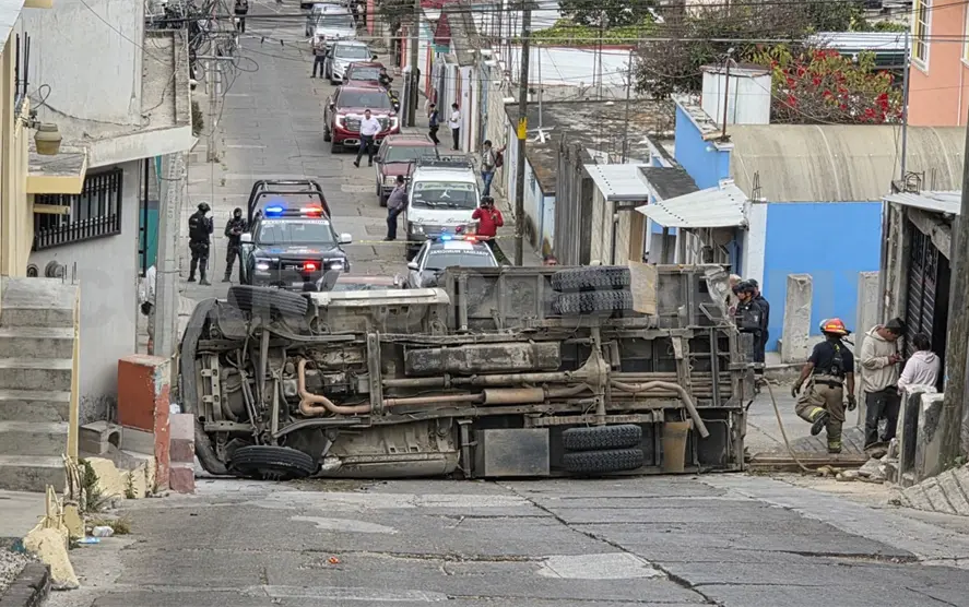La unidad patinó y después se fue hacia atrás de manera descontrolada por varios metros hasta volcar y acabar recostada sobre el lado derecho, causando daños materiales a una camioneta Nissan SUV Magnite, la cual circulaba detrás.
