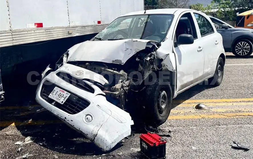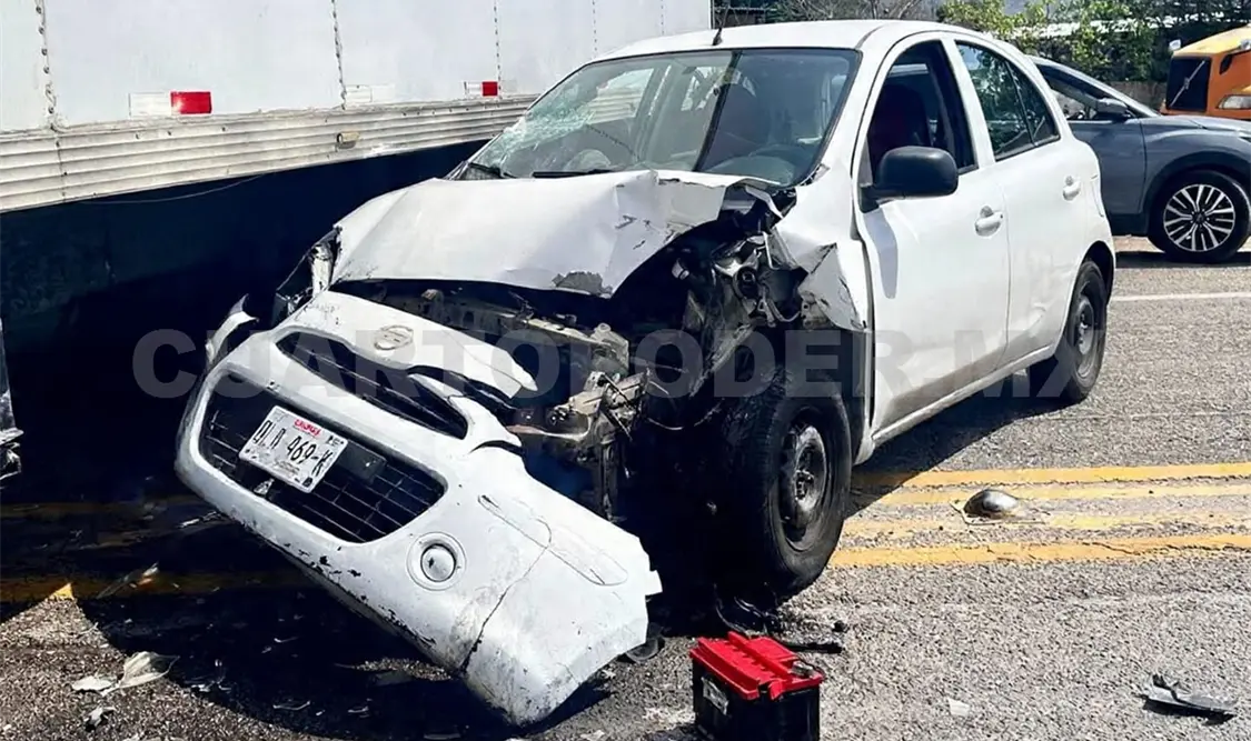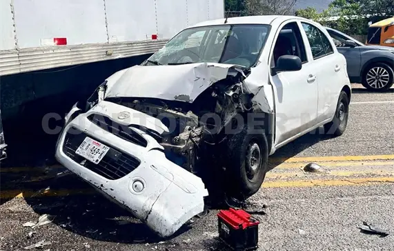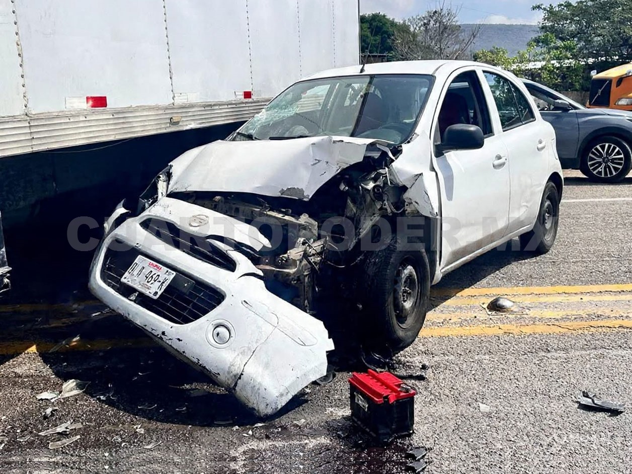 El percance ocurrió a la altura del poblado La Navidad, donde —según versiones de testigos— un camión tipo torton intentó incorporarse a la cinta asfáltica sin las debidas precauciones, atravesándose de pronto al paso de un automóvil compacto Nissan March.