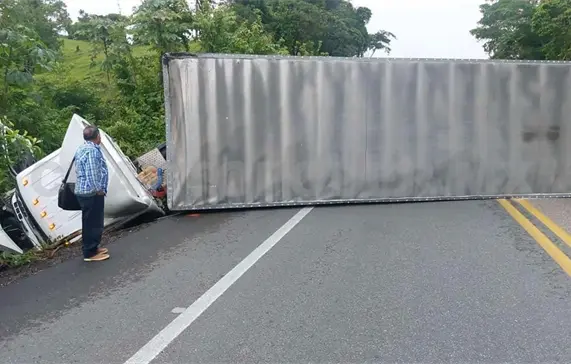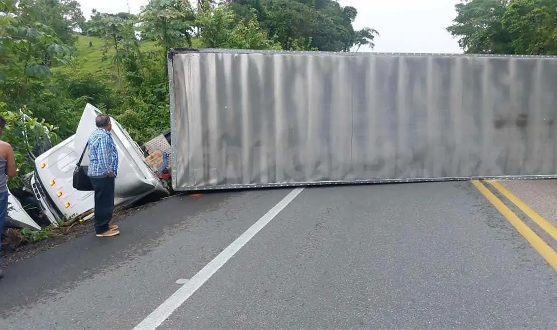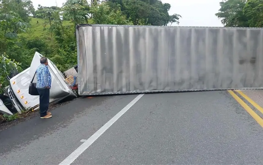 A la altura del kilómetro 60 a las 07:00 horas, un tráiler que iba cargado con electrodomésticos, pantallas y colchones, quedó volcado sobre la vía, desatando una peligrosa y caótica escena.