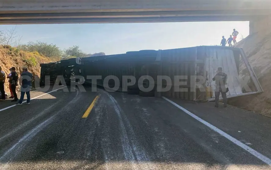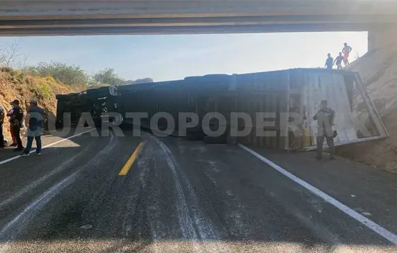 Un tráiler terminó recostado sobre la autopista cuando su operador perdió el control de la pesada unidad. Se sabe que la vialidad permaneció bloqueada durante largo tiempo, teniendo que tomar vías alternas.