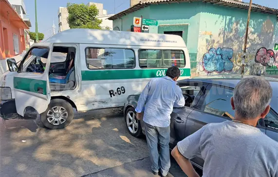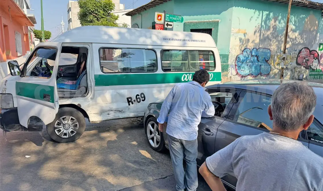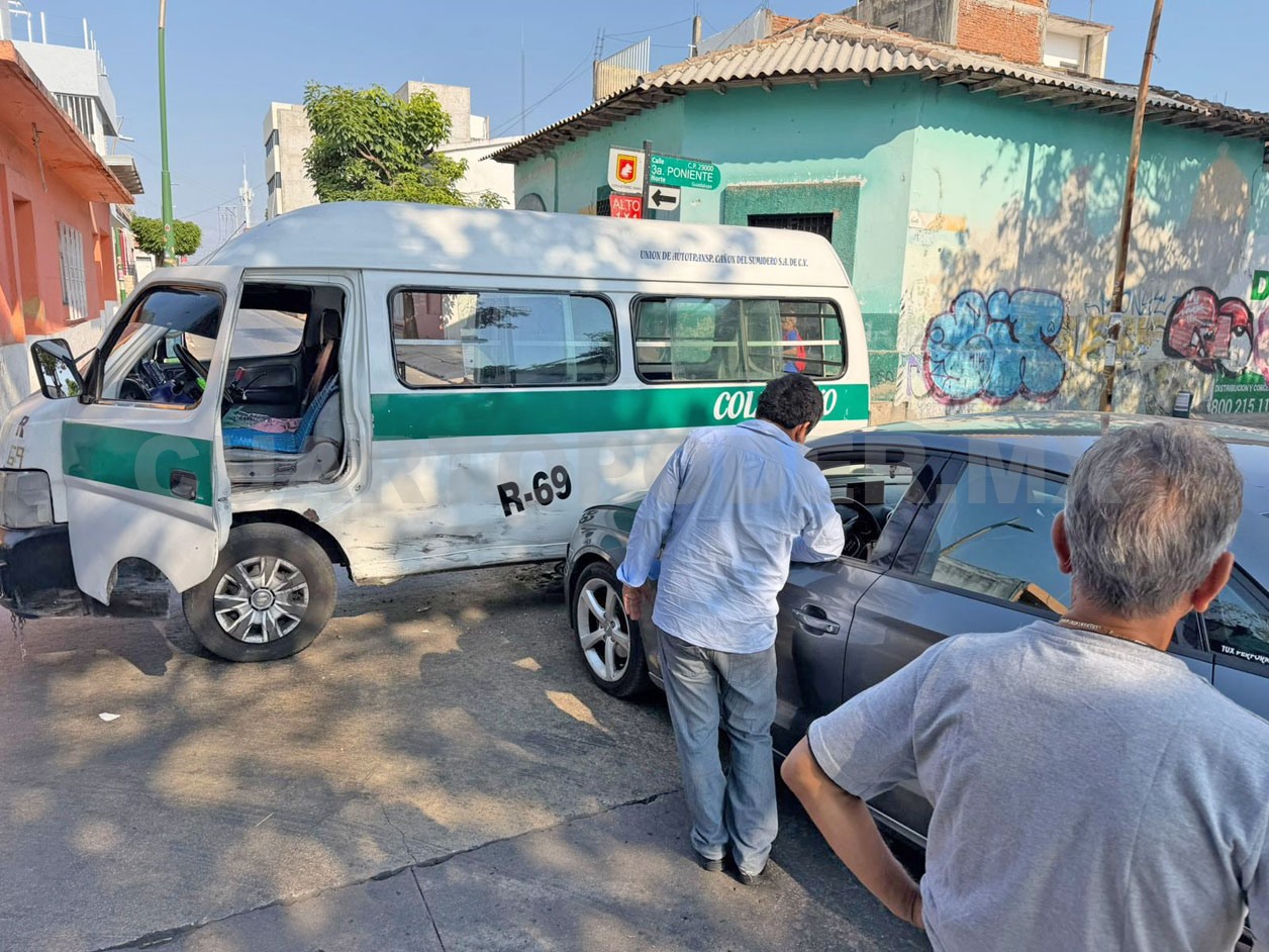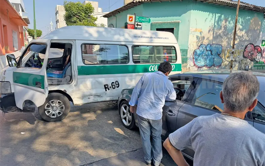 El hecho fue registrado cerca de las 08:10 horas, cuando la combi y el sedán protagonizaron un encontronazo en la esquina de la 3.ª Poniente y 3.ª Norte, debido a que uno de los conductores no tuvo precaución ni respetó el paso.