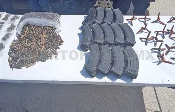 En este acto, la fuerza de seguridad logró la detención de José “N”, Berta “N” y Luis “N”, a quienes les aseguraron tres armas de fuego largas AK-47 con 26 cargadores, 810 municiones, diversas ponchallantas, chalecos.