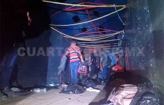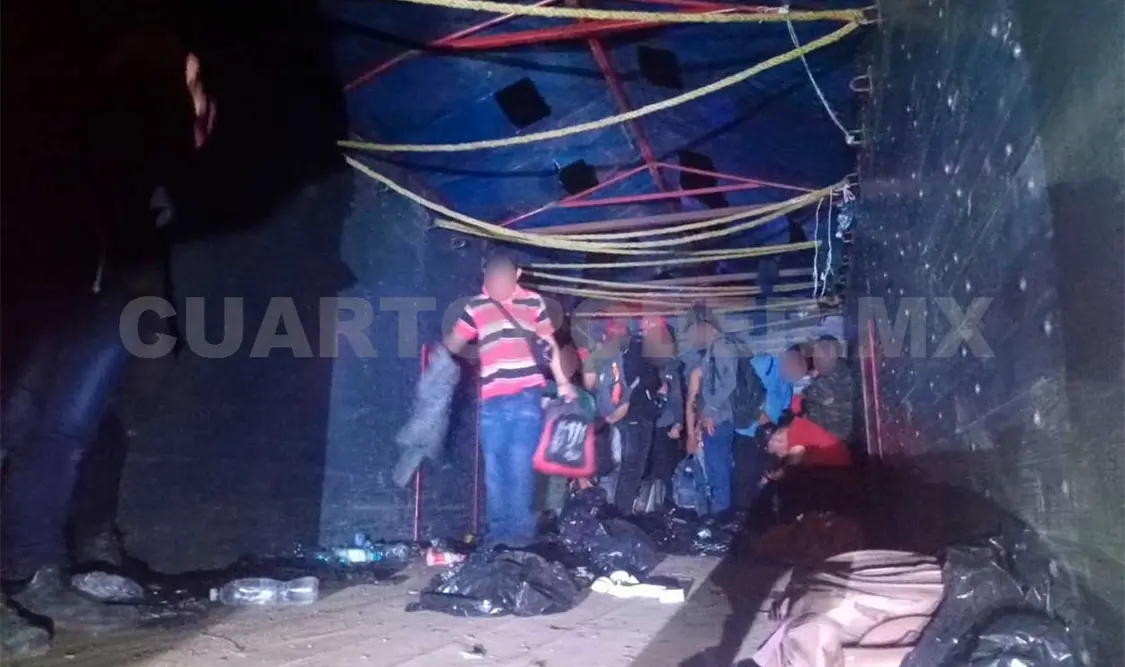 Cuando los policías inspeccionaron la caja del vehículo Kenworth, con placas del Estado de México, el cual estaba estacionado fuera de la vía, vieron que iban hacinados 153 migrantes.