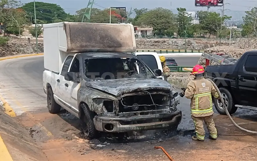 Los agentes de Tránsito y Vialidad Municipal informaron que un probable cortocircuito provocó que la camioneta Dodge tipo RAM 2500m, con caja seca, se incendiara desde el motor.