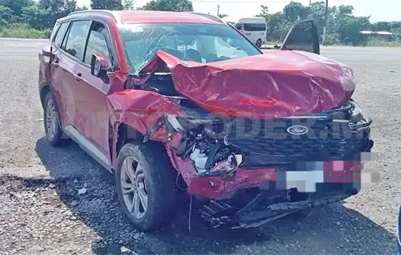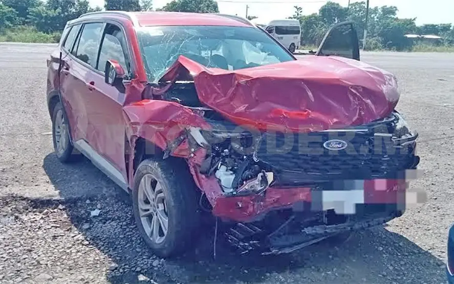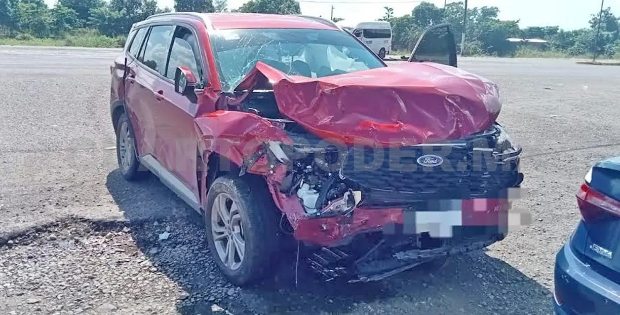 Las unidades involucradas son: una combi Nissan Urvan del servicio colectivo de la ruta Tapachula-Huixtla, con número económico HT25, y una camioneta particular Ford Territory de color rojo.