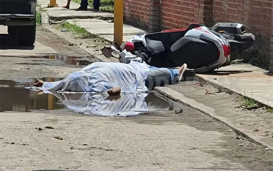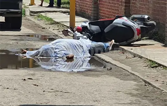 El ahora occiso que vestía playera blanca con estampados de letras negras y rojas, pantalón de mezclilla y zapatos café, quedó tirado a un costado de la motocicleta que conducía, en un charco de agua.