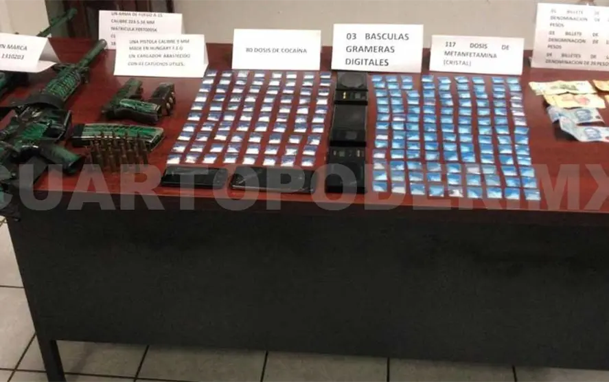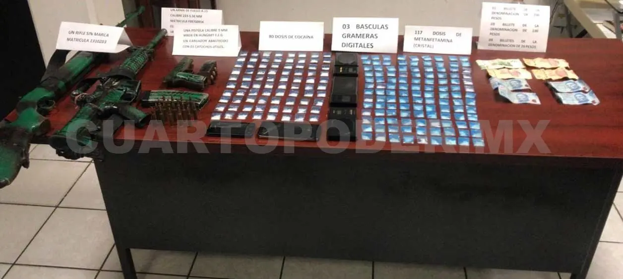 Sin embargo, al ser sometido a revisión le encontraron en su poder la droga, un fusil AR15, un rifle .22 y una pistola .9 milímetros con tres cartuchos útiles, además de una motocicleta Italika, sin placas de circulación, así como una báscula gramera digital y 980 pesos en efectivo.