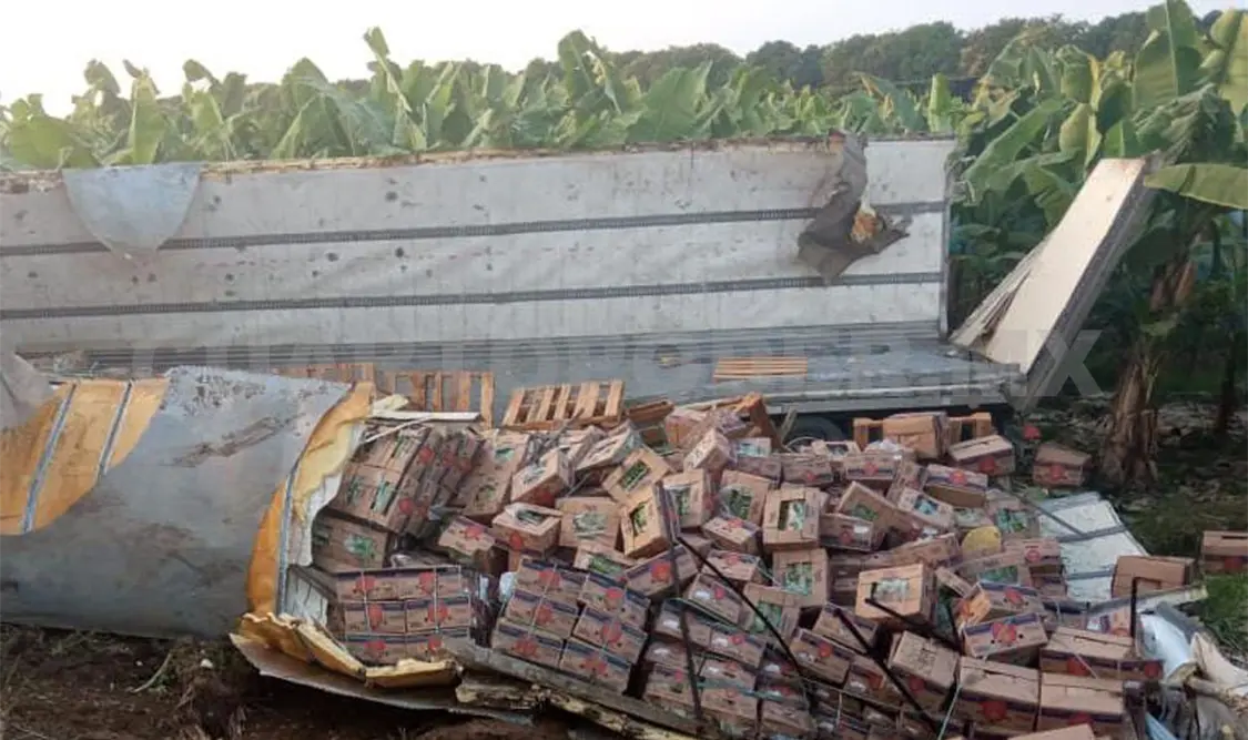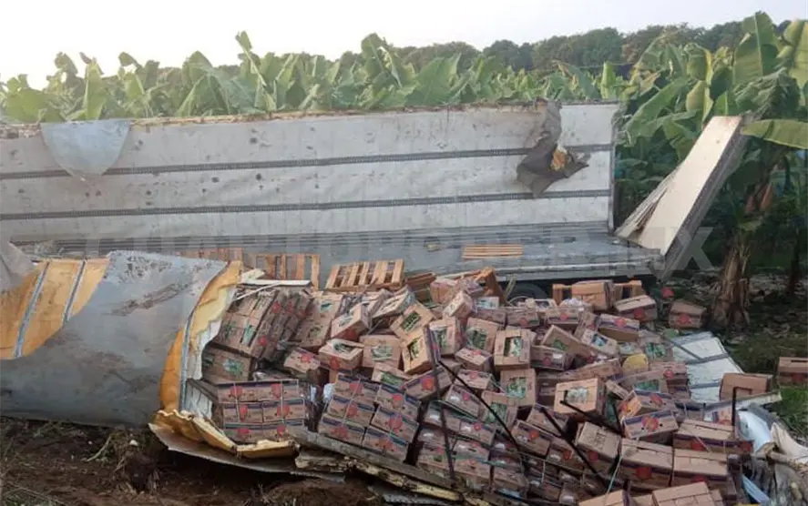 Con daños materiales valuados en aproximadamente 800 mil pesos, se saldó la volcadura de un tráiler que iba cargado con varias toneladas de plátano en el tramo carretero Jaritas-Tapachula, en la demarcación tapachulteca.