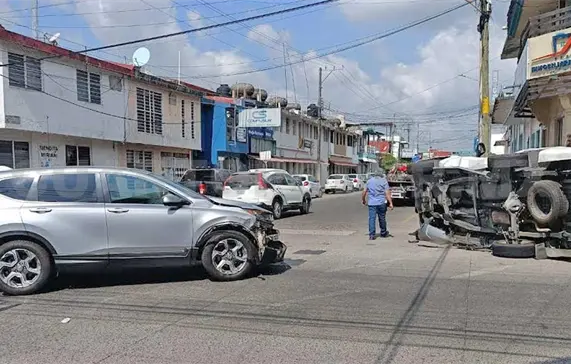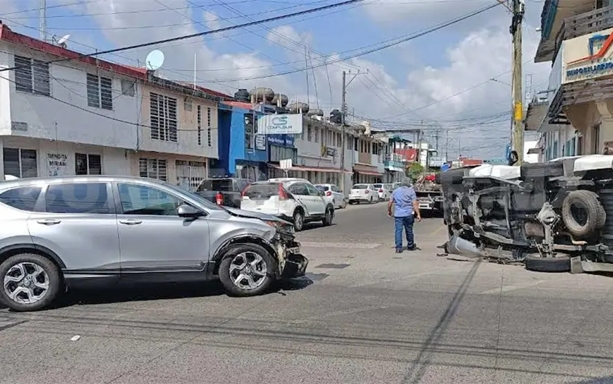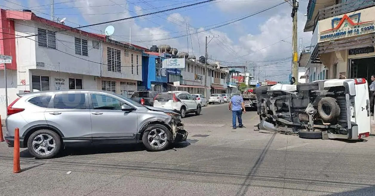 Una camioneta terminó volcada al ser impactada por otro vehículo en la esquina de la 5.ª avenida Norte y 9.ª calle Oriente, en el centro de Tapachula, dejando daños materiales por más de 200 mil pesos, según reportaron las autoridades.