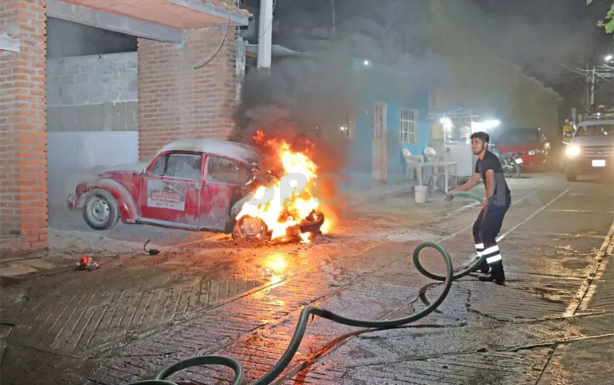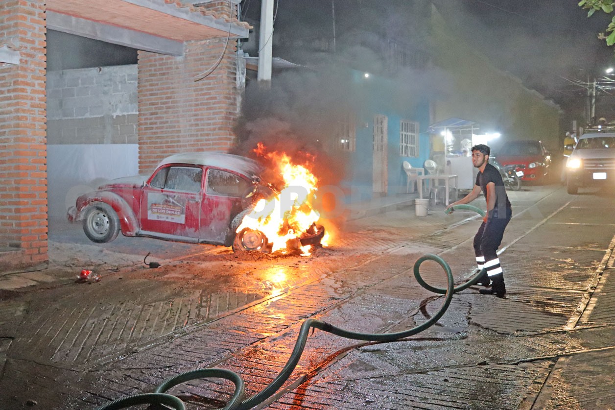 Por poco termina como pérdida total, un Vocho durante las últimas horas de la noche del viernes al sur poniente del municipio de Cintalapa luego de verse envuelto por las llamas que comenzaron en el motor.