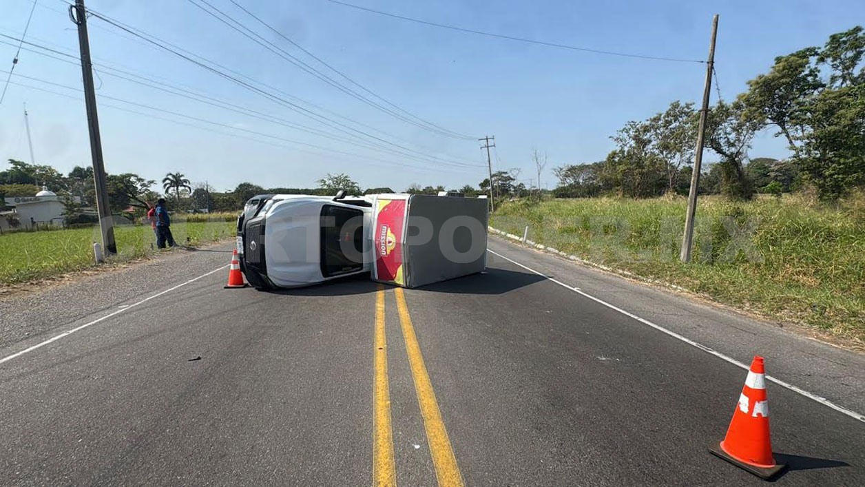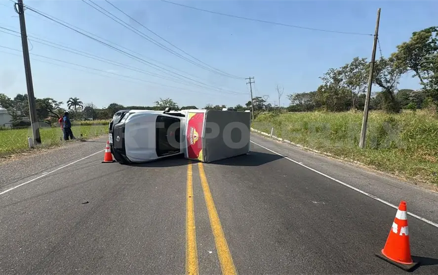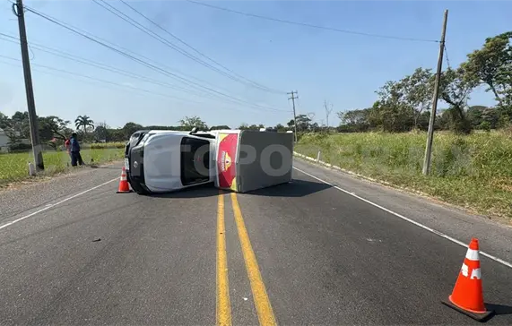 Un vehículo de una empresa distribuidora de productos de salchichonería terminó volcado sobre el libramiento Sur Oriente, en el municipio de Tuxtla Chico, en donde su conductor milagrosamente resultó ileso, solo con crisis nerviosa.