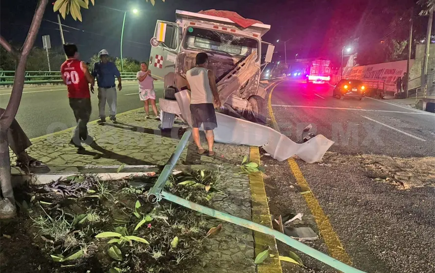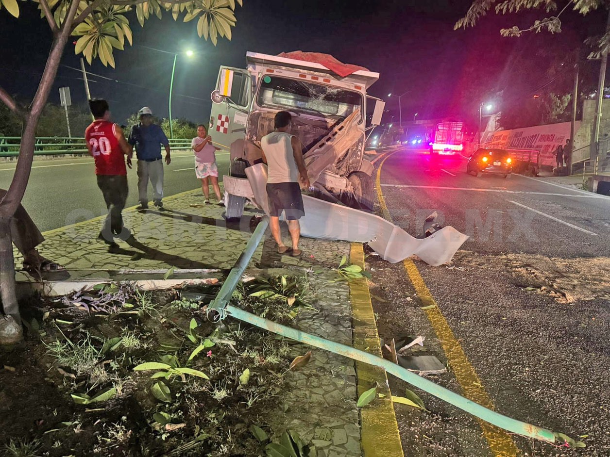 Un camión de volteo terminó sobre el andén central y además derribó una luminaria, esto sobre el tramo carretero Tuxtla Gutiérrez-Chiapa de Corzo a la altura de la colonia Cahuaré, en la demarcación capitalina.