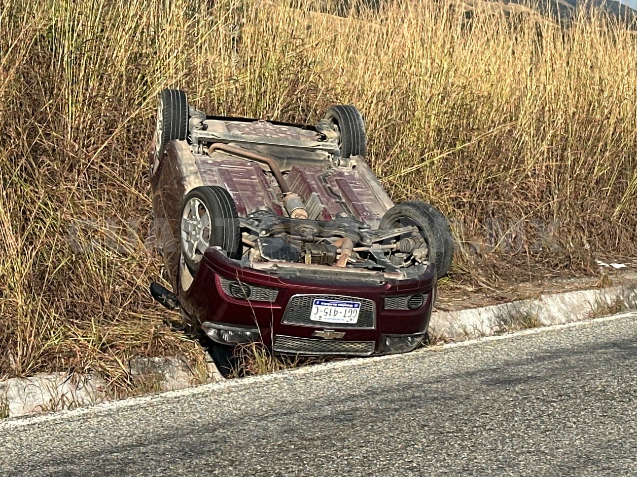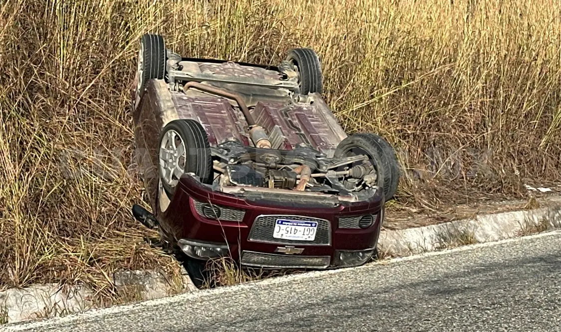 Un automóvil sedán acabó volcado la tarde del jueves sobre la carretera federal que atraviesa el municipio de Jiquipilas, específicamente a la altura del kilómetro 87, en el tramo conocido como Las Jotas-puente Las Flores, dejando como saldo dos personas lesionadas y cuantiosos daños materiales.