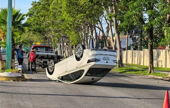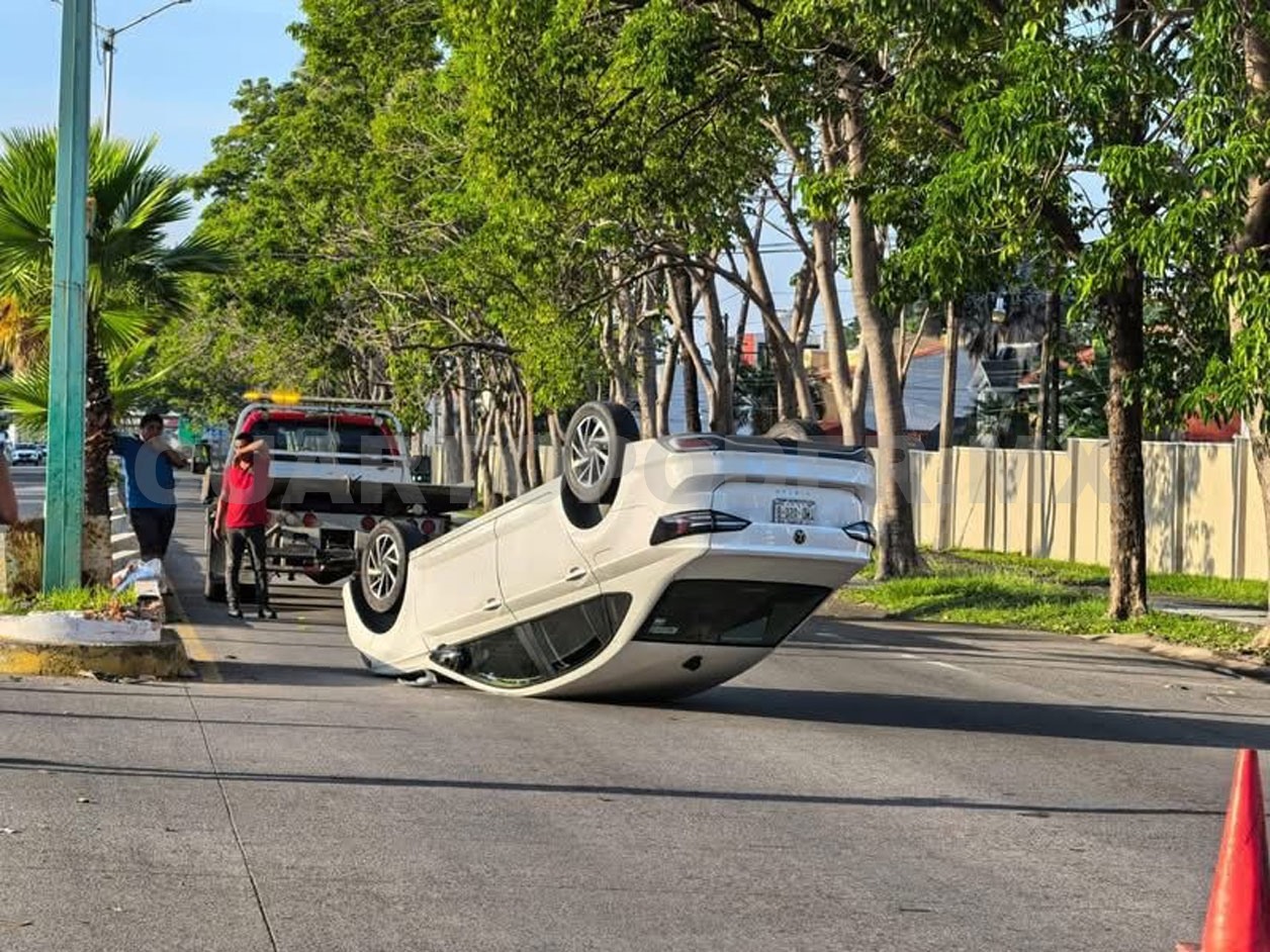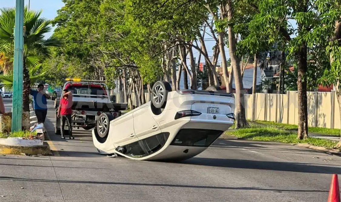 La espectacular volcadura de un vehículo fue registrada el domingo sobre la 4.ª avenida Sur Prolongación, a la altura de la plaza comercial Galerías en la ciudad de Tapachula, lo cual dejó como saldo solo daños materiales.