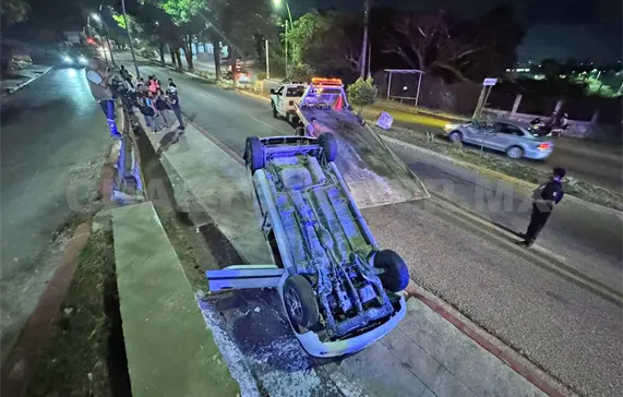 La unidad se salió del camino y volcó sobre el bulevar Quetzales. Como saldo, dos personas resultaron con múltiples golpes en las extremidades.
