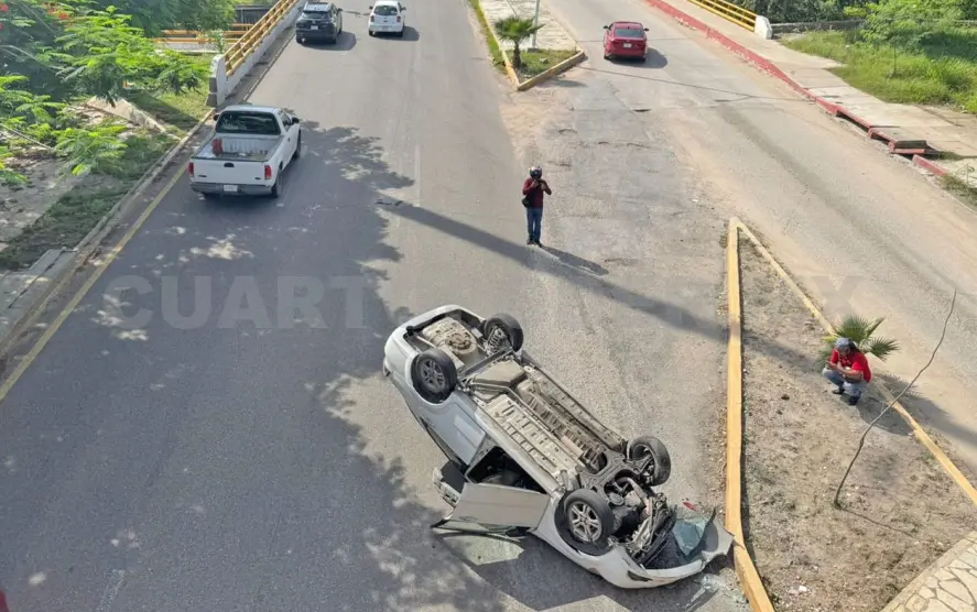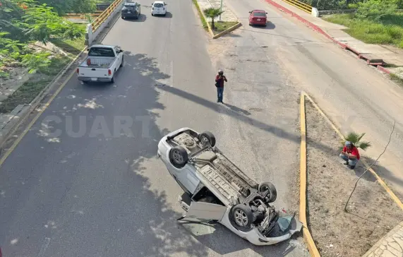 Tras subir a la banqueta, el automóvil se estrelló contra la guarnición, provocando que la unidad volcara.
