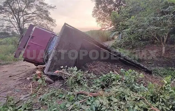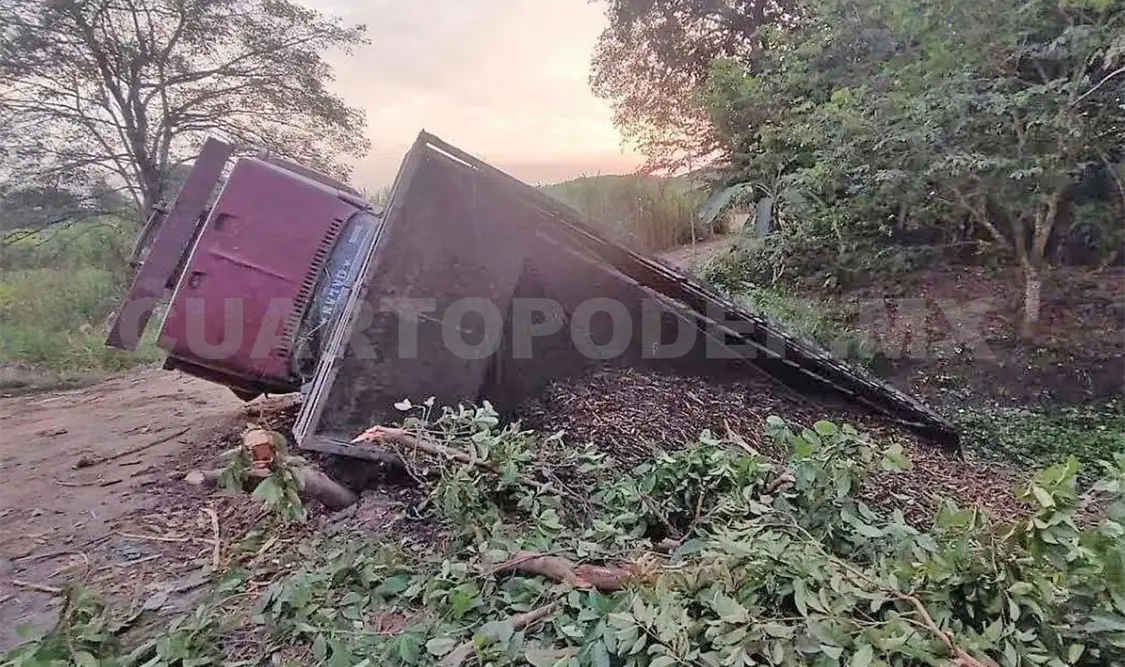 Un camión cargado de caña de azúcar volcó tras caer en una zanja, en un camino de terracería en el ejido Francisco I. Madero, en la zona baja de Huixtla.