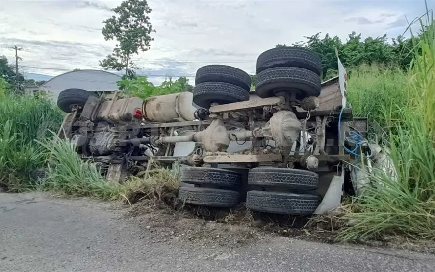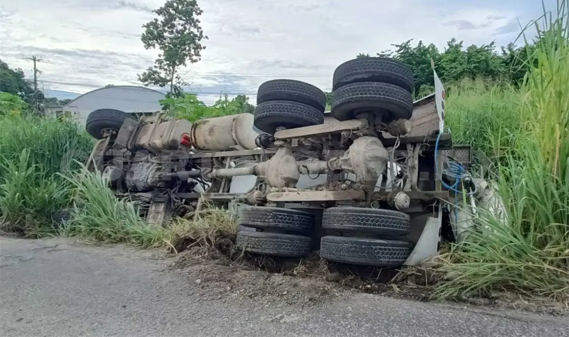Volcado terminó un camión tipo revolvedora sobre el libramiento Sur, a la altura del entronque hacia el cantón Murillo, al sur de la ciudad de Tapachula, pero a pesar de lo aparatoso del percance, el conductor resultó ileso.