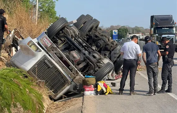 Una mala maniobra hizo que el chofer de un tráiler, que transportaba material de azulejo, se estrellara contra la cuneta y volcara sobre la carretera Tuxtla Gutiérrez-Ocozocoautla a la altura del kilómetro 142 y a 50 metros del retorno que comunica con el Centra, en la capital Tuxtla Gutiérrez, en las primeras horas del lunes.