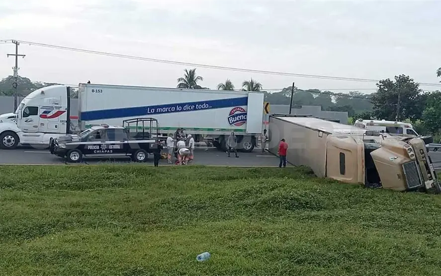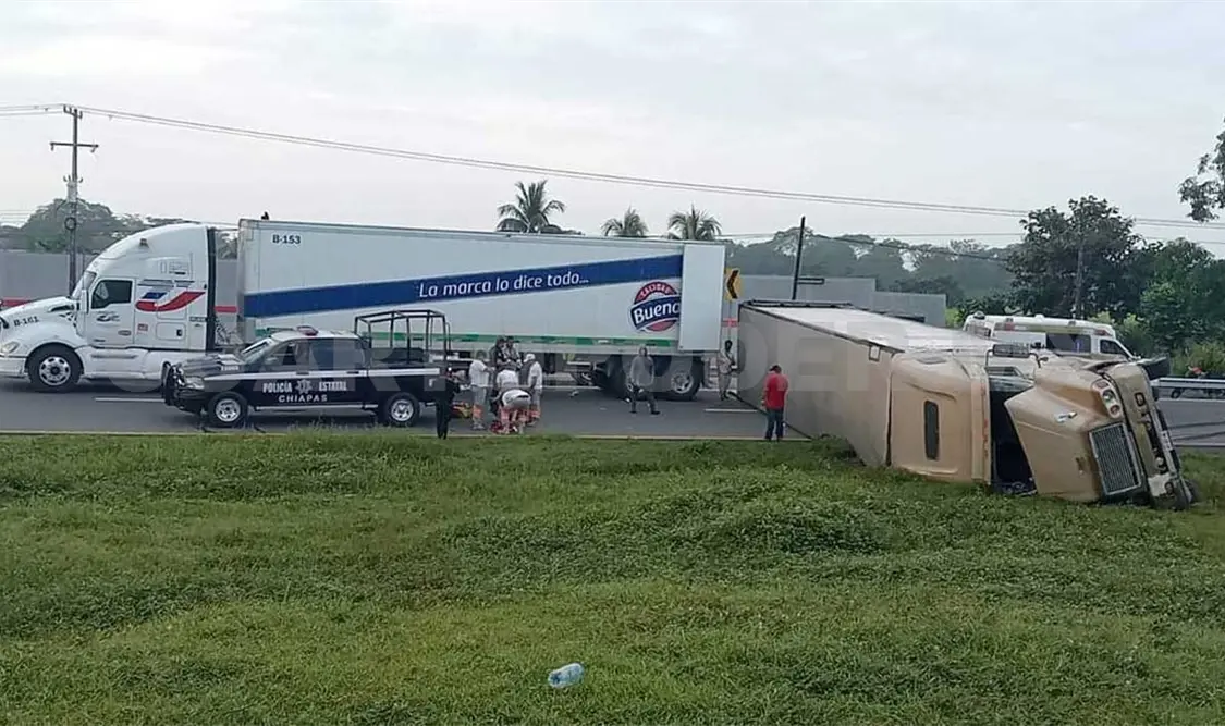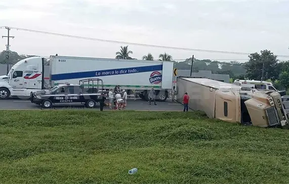 Un tráiler que transportaba varias toneladas de productos de abarrotes terminó volcando al chocar contra la barra metálica de protección de la carretera, en el tramo Villa Comaltitlán-Huixtla, en la demarcación del municipio huixtleco.