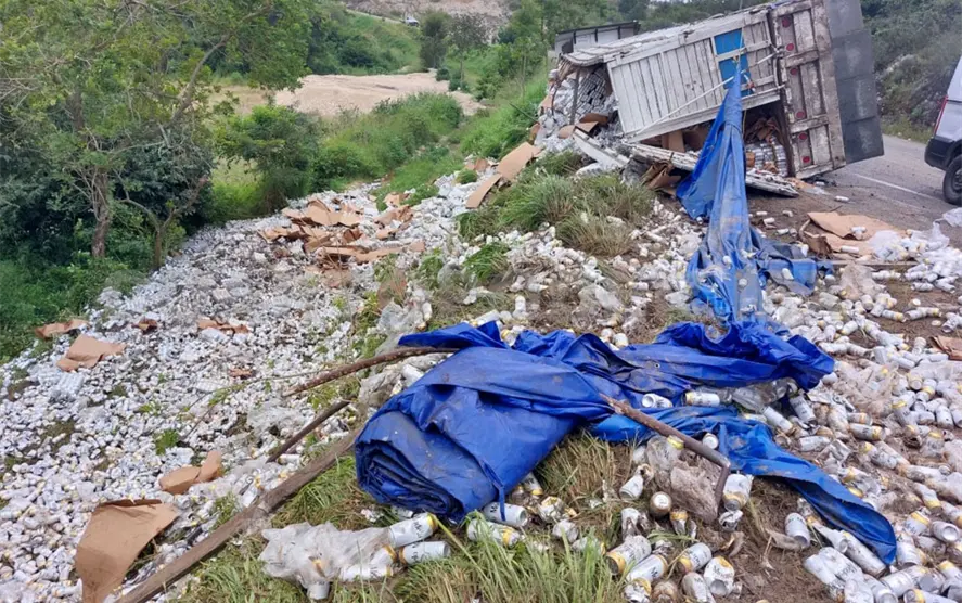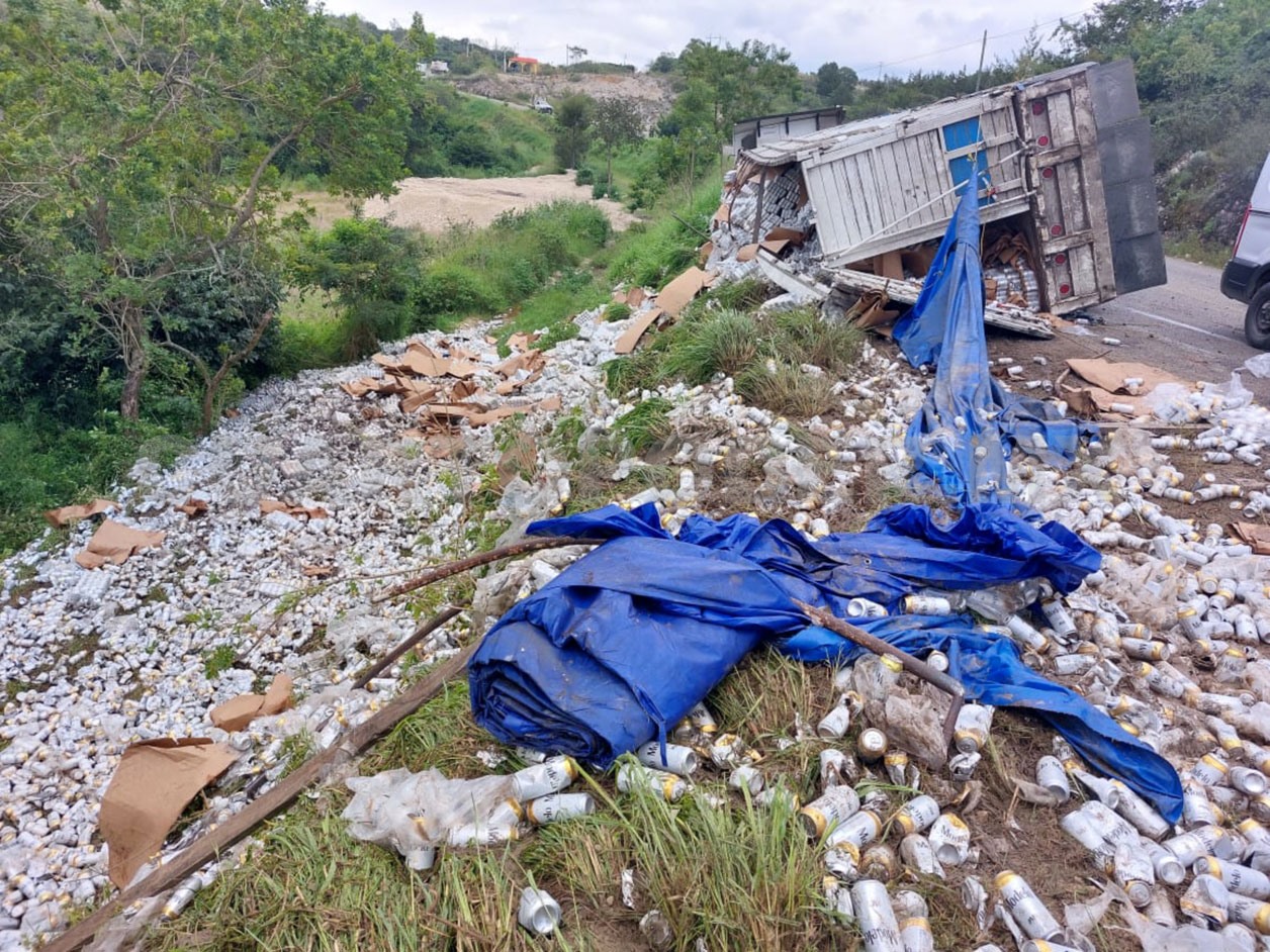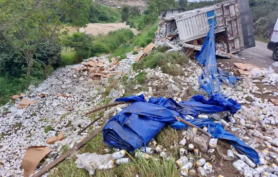 Trascendió que el chofer del tractocamión de la marca International de color blanco, transitaba sobre la carretera estatal y transportaba varias toneladas de cerveza procedente de Guatemala, cuando perdió el control al salir de una curva peligrosa.