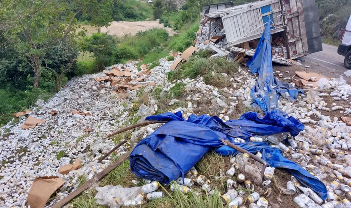 Un tráiler que transportaba varias toneladas de cerveza en lata volcó durante la mañana del miércoles, cuando circulaba en el tramo estatal La Independencia-Comitán, lo que dejó cuantiosas pérdidas materiales y movilizó a los cuerpos de emergencia.