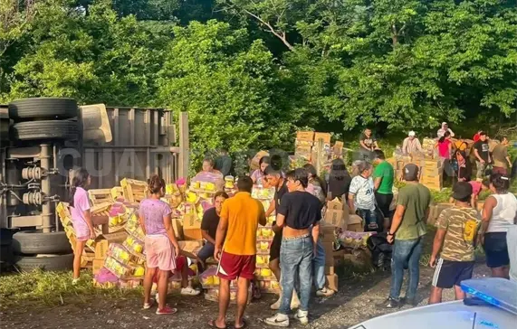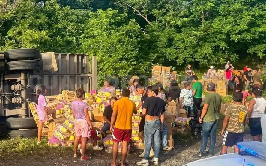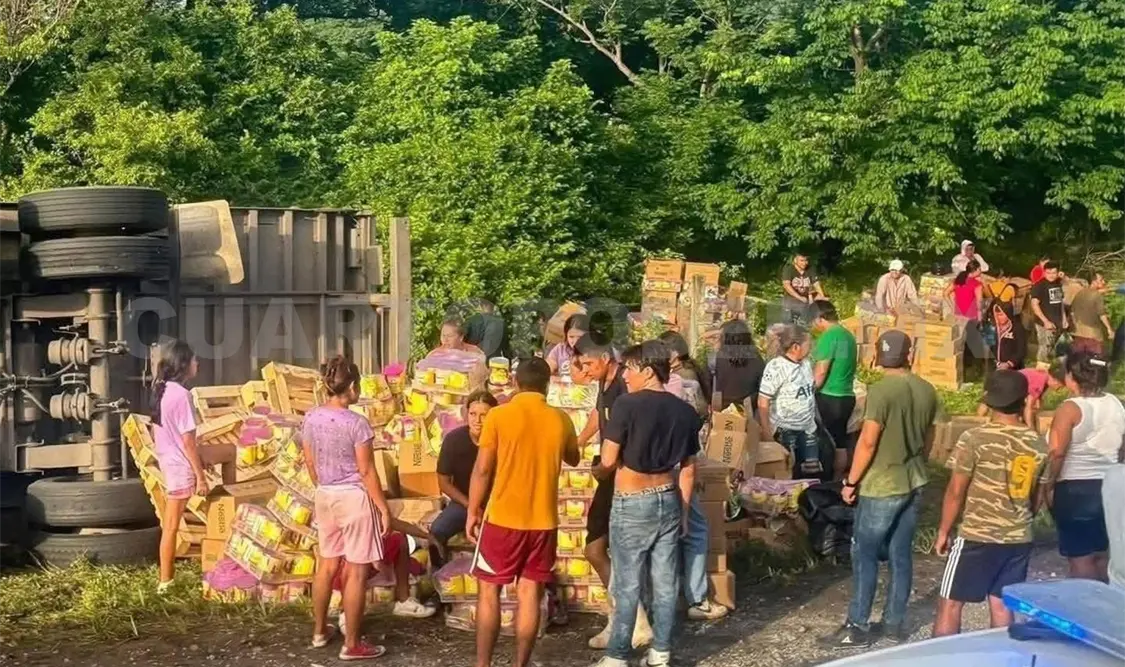 Trascendió que al pasar el mediodía, usuarios del tramo carretero Tonalá-Pijijiapan se percataron de una aparatosa volcadura en la vía federal, donde el conductor pudo salir bajo sus propios medios de la cabina del pesado tractocamión, observando que la mercancía se encontraba dispersa entre la maleza.