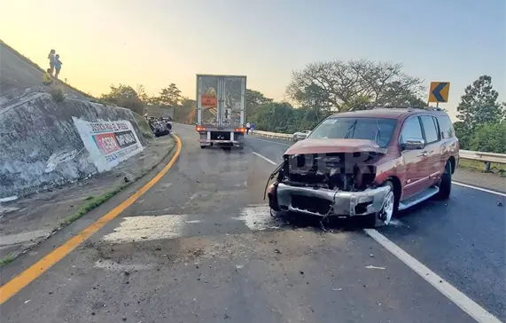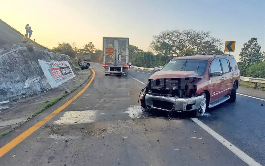 Presuntamente al tomar la curva a exceso de velocidad perdió el control del volante y chocó contra el muro, por lo que a consecuencia de esto la segunda unidad acabó volcada fuera del camino, aunque el conductor resultó ileso.